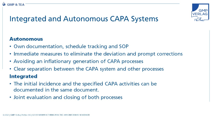 A CAPA system should be understood as an important element of the pharmaceutical quality system and implemented uniformly throughout the company or group. In principle, it can be implemented in two different ways: as an autonomous or as an integrated system.