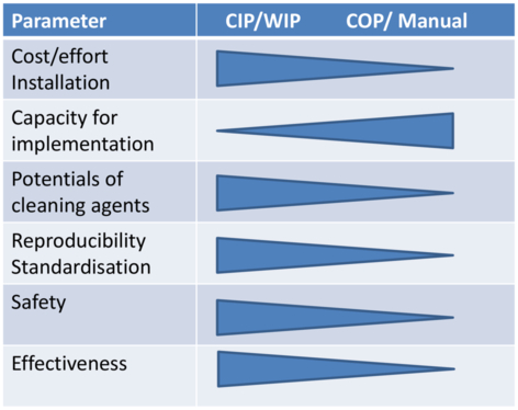 A plant that has proven to be CIP-capable for a certain product may turn out not to be CIP-capable for another product. The degree of cleanliness that can actually be achieved can only be determined on a case-by-case basis for a product or the reference substance of a product group. A CIP process is therefore specifically adapted to a particular manufacturing process. For this reason, automated WIP cleaning is a good middle ground if various individual parameters are to be taken into account.