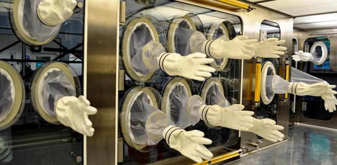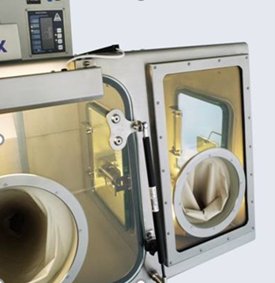 - Glass window with glove ports on the user side to perform operations within the isolator