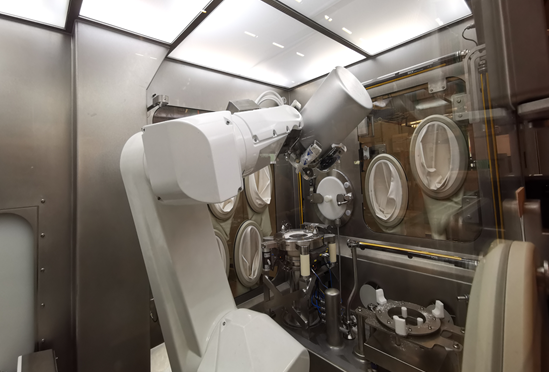 Further protection of the employees can be the use of robotic systems in the isolator. By using robots, manual interventions in the isolator via glove ports are avoided. The use of robots or other automation systems can also reduce the number of gloves or eliminate them completely. The danger of employees working close to the highly active and highly dangerous pharmaceutical substance is thus eliminated. Work and process steps can be monitored from a safe distance. Robots have developed rapidly in recent years. They can now also perform complex operations, and even perform the subsequent cleaning of the isolator and all internals in a validated manner. Figure 5 shows a robot that is used to empty a sterile active ingredient into aluminium cans.