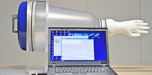 Use of physical testing makes it possible to validate the testing of the glove and sleeve. Ideally, the glove port is also included in the test to check the correct fitting of the glove and the integrity of the glove on the isolator. The most commonly used method is the pressure drop test. In this method a test device is connected to the glove with a connection port (see Figure 4).