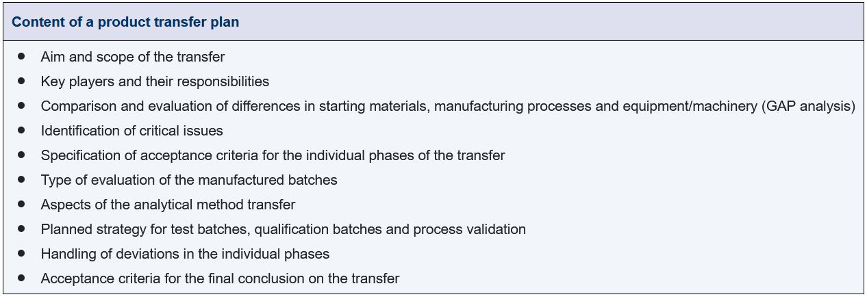Good project management is vital to the success of a transfer project. Detailed documentation of the product transfer is also very important. This is an important aspect of the knowledge transfer on the one hand, and it is required for the change notification of the contract manufacturer (variation to a marketing authorisation) on the other, or for the inspection carried out in the case of such a change notification. The acceptance criteria for a successful product transfer are specified in the transfer plan. If a master transfer plan is available, the requirements and contents of this master plan are described in greater detail in the transfer plan. It contains the planned and implemented steps for the transfer. Figure 17.A-13 contains a list of components that should be included in a transfer plan.