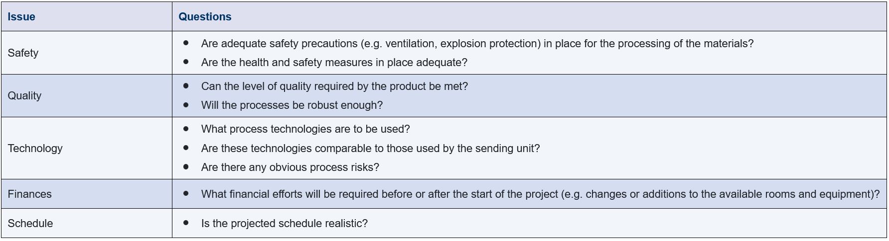 As a part of risk management, new information and insight must undergo risk assessment on an ongoing basis during the transfer project. Ideally, the assessment should be carried out by both transfer partners. This simplifies the transfer of knowledge on the basis of specific product knowledge, experience gained by the contract giver during product manufacture, as well as general experience with technological processes and other products at the contract manufacturer.