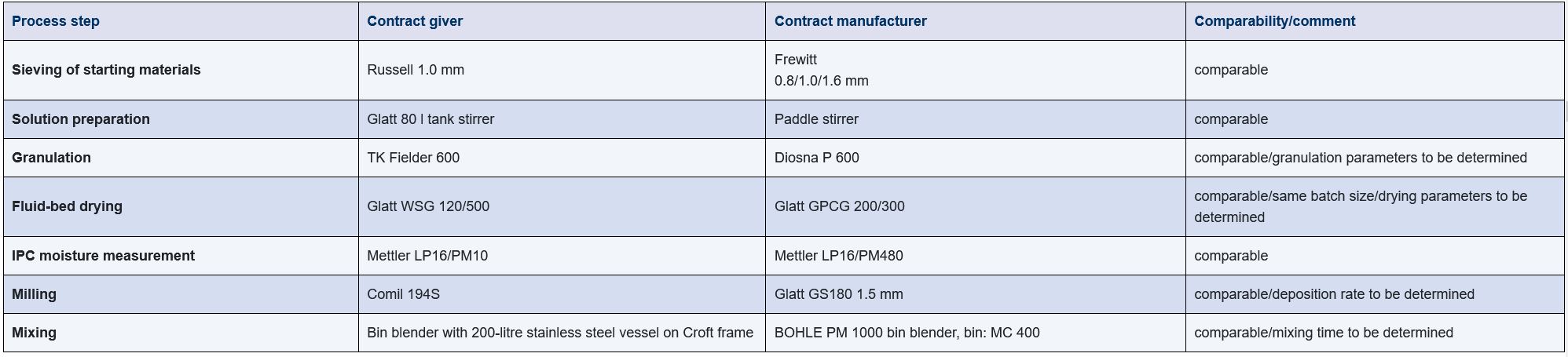 A comparison of the processes and technologies used at the two manufacturing locations is vital for the evaluation of the potential risks of the transfer project. The individual process steps of the sending unit and the contract manufacturer are compared. Differences in machines, systems and batch sizes are identified. These differences are an indication of the changes required for an authorisation adjustment strategy.