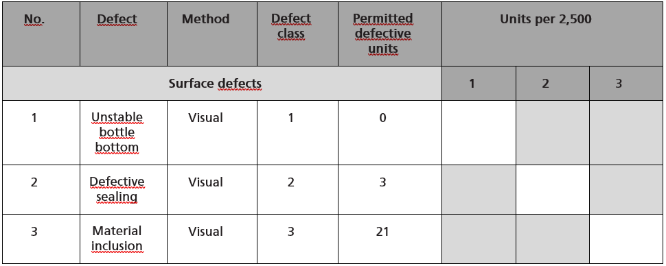 Figure 1 shows an example of a section of a defect evaluation list for packaging.