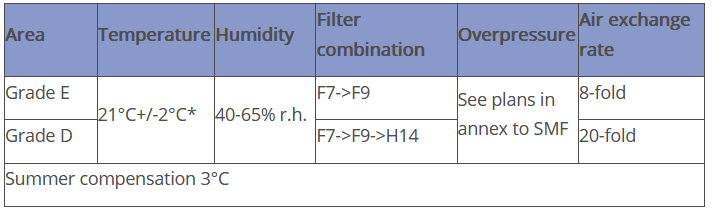 All areas for the open handling of raw materials and/or product are qualified in accordance with cleanroom Grade D. Secondary packaging is carried out in cleanroom Grade E."