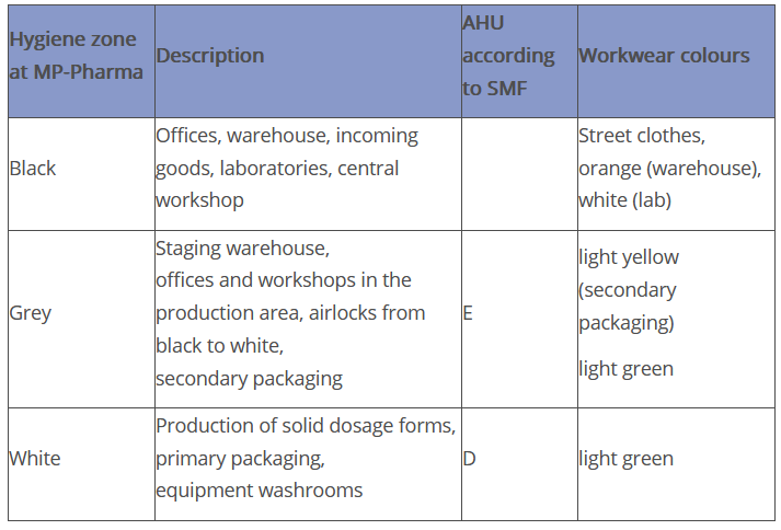 The virtual company Peither Pharma GmbH produces exclusively solid forms according to the Site Master File (SMF). No narcotics, CMR substances (carcinogenic, mutagenic or reprotoxic substances), sensitising or highly active substances are processed. The present zone concept, material and personnel flows and all other measures to avoid contamination are adapted to this type of product. This includes the use of the terms "grey" and "white" for the middle or cleanest hygiene zone in the company, which is not standardised or normed. These terms are therefore used in the individual companies for different cleanliness classes and must be defined in the zone concept so that their concrete meaning is clear for internals and externals.
