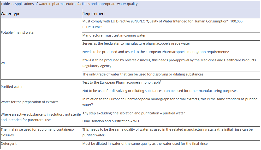 The European Medicines Agency has produced the final version of its guideline ‘Guideline on the quality of water for pharmaceutical use’1. The document addresses purified water and WFI. The water source of greatest impact is WFI, because this is used as an ingredient water. This grade of water is also supplied for cleaning of product contact equipment and components, and it is the water supply to autoclaves in the form of steam. Purified water is used for equipment processing; it is supplied to laundries, used for hand washing, and as the source water for distillation.