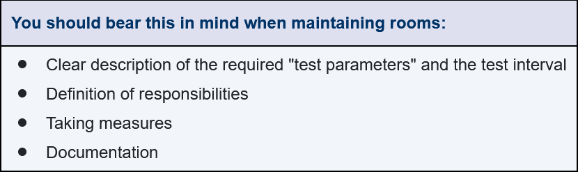 The above-mentioned points do not necessarily have to be part of the maintenance. For example, the test of sufficient room capacity could also be an integral part of regular self-inspections, so that changes in the necessary production capacity or in the production process can be reacted to promptly. In any case, it is important to evaluate and document any spatial bottlenecks that may be identified – regardless of the "event" (self-inspection, maintenance, etc.) to which it is linked.