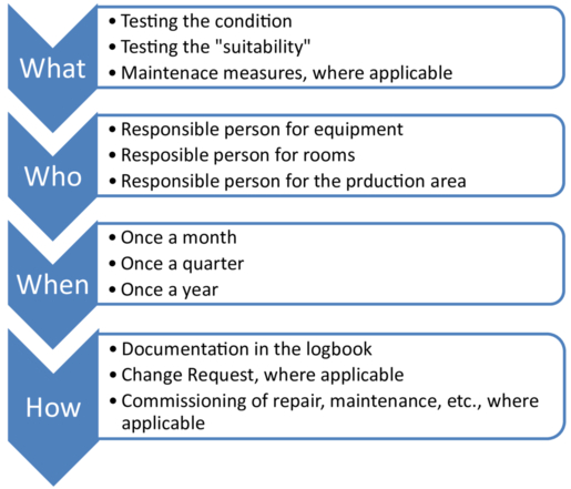In particular, the examination of the "further suitability" of the rooms or equipment in terms of size, number and production sequence should also be carried out regularly (periodic review) and on each change (change management).