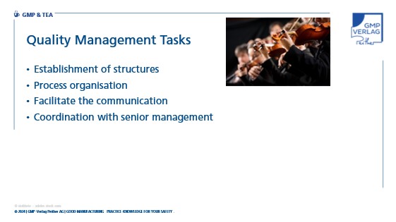 In addition to management tasks, quality management plays a crucial role. Just as the first violin in an orchestra sets the tone, quality management ensures the structure, organisation and coordination of the individual instruments – excuse me: PQS elements – with each other.