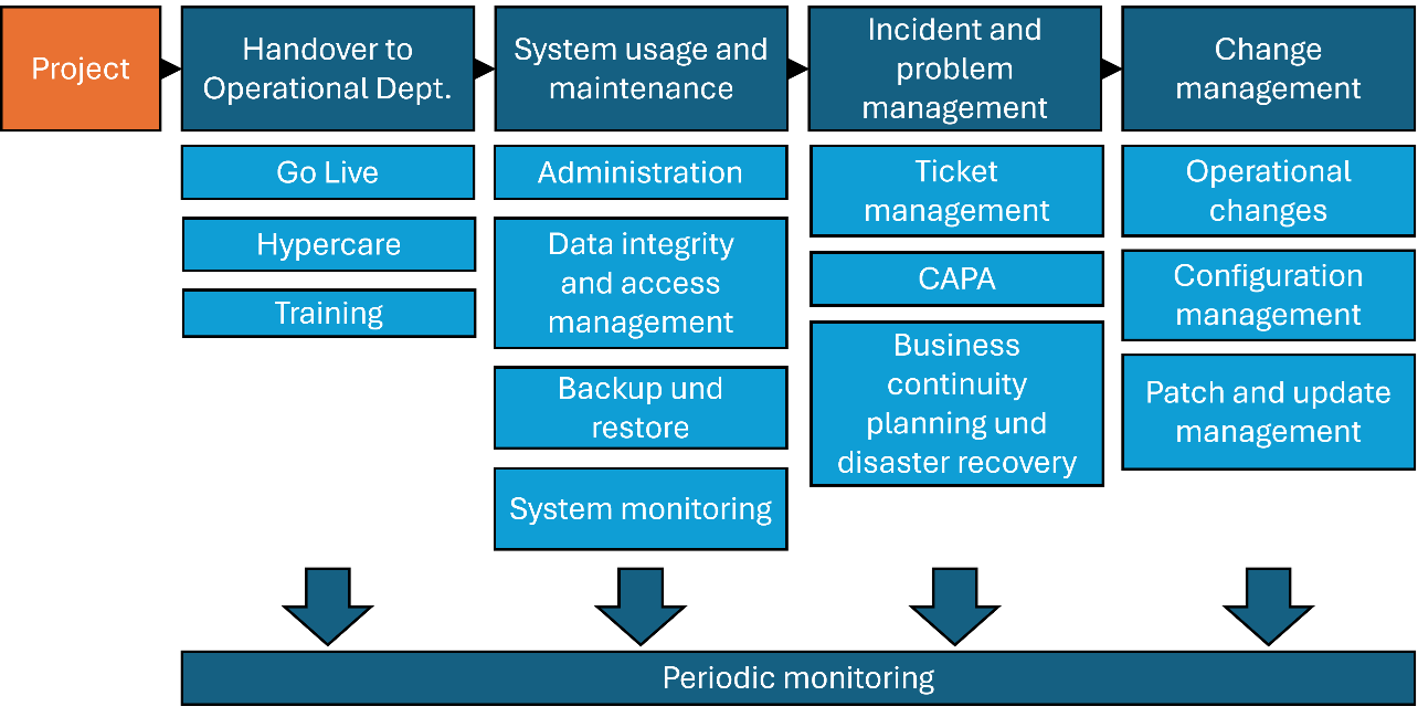 The implementation of computerised systems involves several steps to ensure that the systems meet the requirements and are ready for productive operation. Regarding go-live of productive operation, however, preparatory activities should already be planned during the implementation phase of the project.