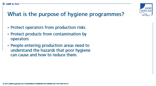 Hygiene programmes are designed both to protect the health of operators from production-related hazards and to protect manufactured products from contamination by employees.