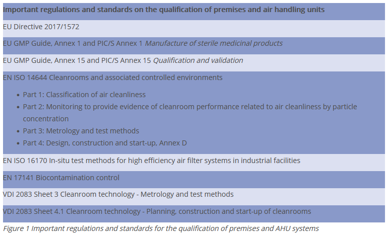 Annex 15 to the EU GMP Guide and the identical Annex 15 to the PIC/S Guide to Good Manufacturing Practice of Medicinal Products provides assistance or guidance on how this proof of suitability for the qualification of premises and AHUs in the pharmaceuticals industry can be carried out. EU Annex 1 applies specifically to the manufacture of sterile medicinal products, which, however, again refers to Annex 15 for equipment qualification.