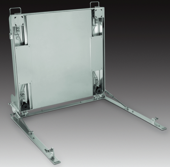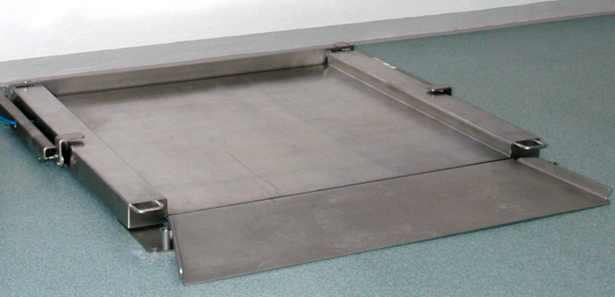 It is important that there are no areas that cannot be accessed, especially in the case of large floor balances (e. g. for containers). Underfloor installations have disadvantages, e. g. poor accessibility and cleanability of the weighing pit. This can only be cleaned properly when the cleaning process is intensified. Folding flat-bed scales where the weighing platform can be unfolded, represent a major improvement because of the hygienic design (Figure 11.B-14 and Figure 11.B-15).
