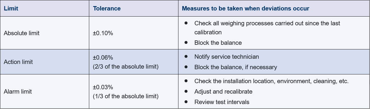 Usually, certified weights from class E2 to F2 or M are used for the tests depending on the weighing range and the balance. For the specification, absolute limits as well as warning and action limits can be defined that are evaluated using control charts, for example (see Figure 11.B-17). The measures required depend on the type of deviation. Violation of the absolute limit represents the worse case. If it happens, the balance must be taken out of operation. Furthermore, all of the weighing processes carried out since the last successful calibration must be checked (out of calibration).