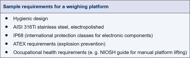 To prevent contamination and cross-contamination, the surfaces of the balance including the display and control units must be easy to clean and resistant to cleaning agents. This requires the use of suitable materials and a suitable housing design. These requirements apply, in particular, to parts that may come into contact with the starting materials, e. g. the weighing platform. These parts are usually made of stainless steel, e. g. 1.4571 (AISI 316Ti), cold rolled, electropolished (surface roughness <0.8 µm). Other requirements for the design of balances are summarised in Figure 11.B-13.