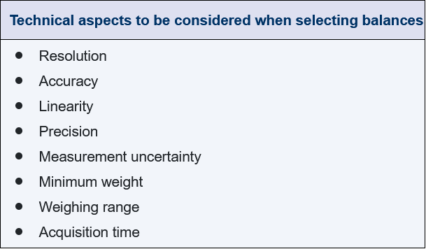 - Which technical aspects and design features must be considered when selecting a balance?