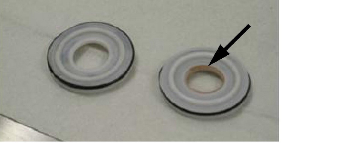 The introduction and distribution of rouge particles from water and steam systems to production/media systems and facilities represents a particular problem. There is then a real risk that the particles will be transported into the product (the usual size of rouge particles ranges from 0.01 to 10 µm). The system must therefore be strictly controlled. If rouging occurs, suitable measures must be put in place. Rouging can often be detected on the seals (Teflon) of open systems because this is where the transported particles tend to accumulate (see Figure 5.E-7 ). As the particles are usually very small, they cannot be seen with the naked eye. Visible particles are usually larger than 50 µm.