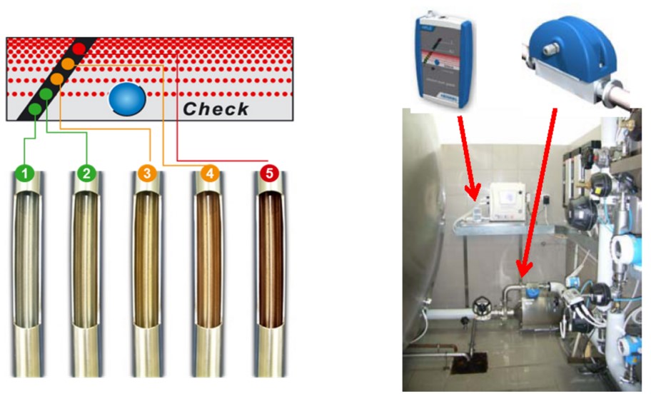 Figure 5.E-8 Rouge monitoring in pharmaceutical water systems using the HPLG (Henkel Passive Layer Guard); left: schematic representation of the rouge display; right: practical use (source: Henkel Beiz- und Elektropoliertechnik GmbH & Co.KG. 19306 Neustadt-Glewe, Germany)
