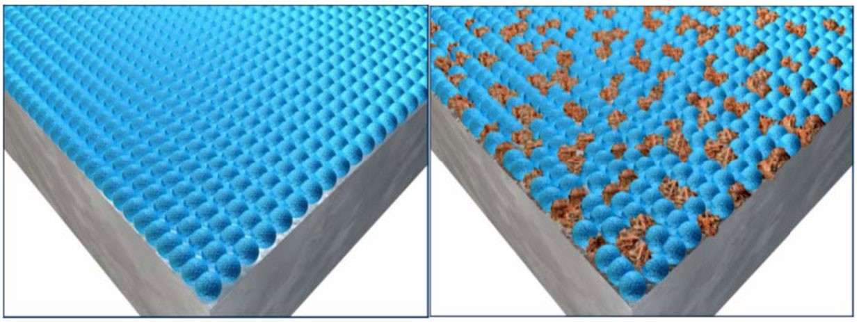 Figure 5.E-4 Schematic representation of a metal surface with intact passive film (left) and with a partially damaged passive film and (the start of) corrosion (right) (Source: Henkel Beiz- und Elektropoliertechnik GmbH & Co.KG, 19306 Neustadt-Glewe, Germany)