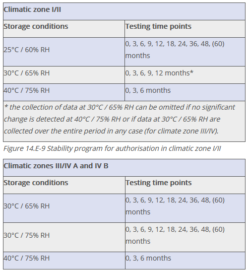 For storage conditions and test frequencies, the Q1A(R2) and WHO (Technical Report Series, No. 1010, Annex 10) guidelines are applied (see Figure 14.E-9 and Figure 14.E-10).