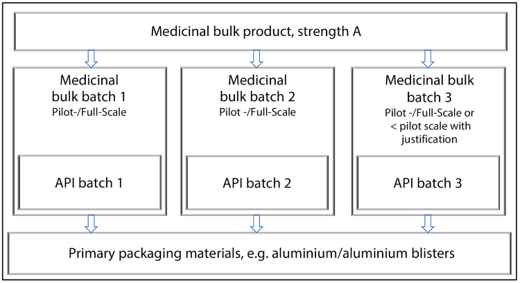 At least three batches of the same formulation and primary packaging should be stored for authorisation stability. Three different API batches should be used. Two of the three finished medicinal product batches must be at least pilot scale size (1/10 of the subsequent production batch or 100,000 units). The third batch may be smaller, if justifiable, but shall be at least 25,000 units. This applies to each strength and primary packaging unit. The procedure is illustrated in Figure 14.E-8.