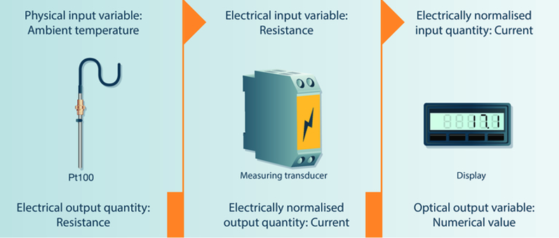 Generally, measurement chains are used to normalise different output variables to a uniform measurement signal. This enables signal transmission to a central processing and control unit. Each sensor within this measuring chain converts a measured variable recorded as an input signal into a corresponding output signal. This is illustrated schematically in Figure 3.